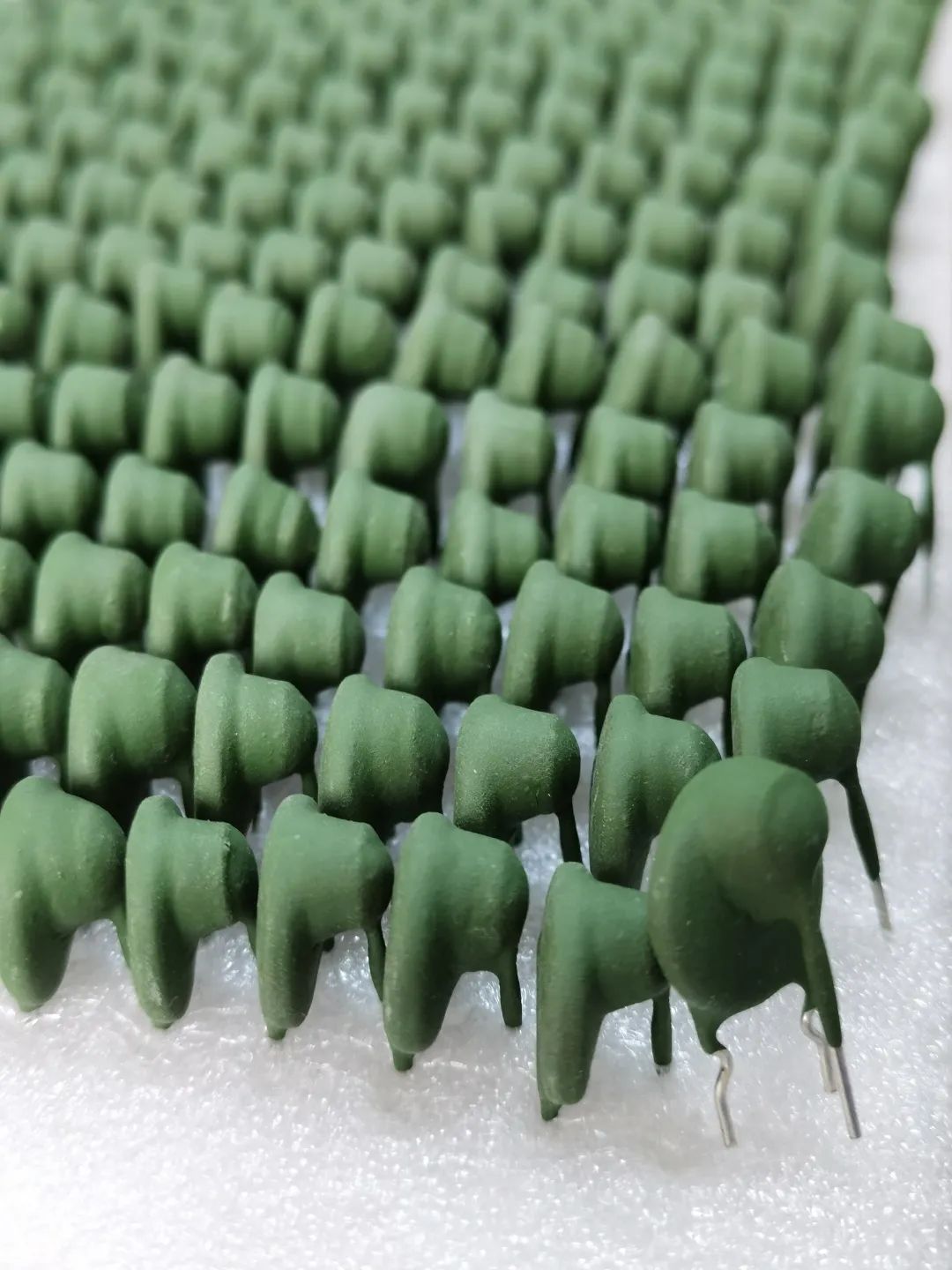 走進(jìn)生產(chǎn)車間,筆者看到流水線上正加工生產(chǎn)著綠色的壓敏電阻,借助傳送紙帶,排列整齊的銀色芯片經(jīng)過自動化設(shè)備的加工變成綠色的成品。